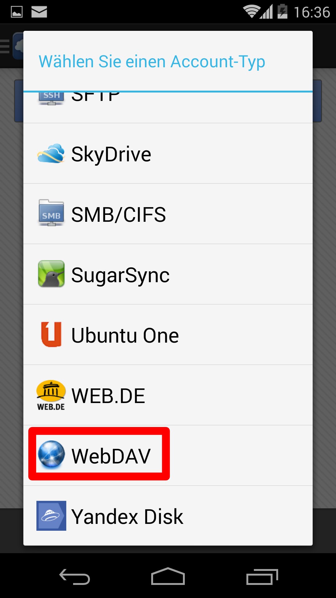 - Account hinzufügen und WebDAV wählen